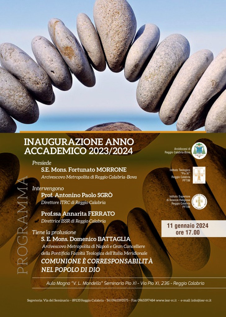 Giorno 11 gennaio 2024 alle ore 17:00 presso l’Aula Magna “V. L. Mondello” del Seminario Arcivescovile “Pio XI” si inaugurerà l’Anno Accademico 2023/2024 dell’Istituto Teologico “Pio XI” dell’Issr V Zoccali. Terrà la prolusione S. E. Mons. Domenico Battaglia, Arcivescovo Metropolita di Napoli.