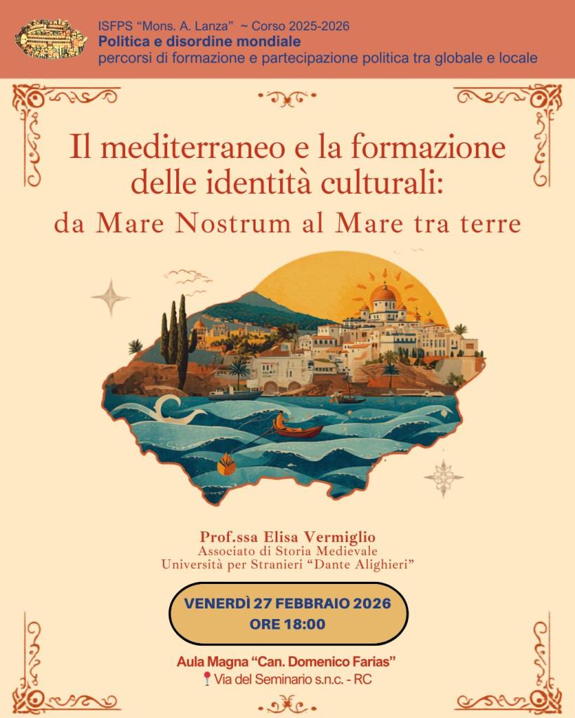 Il mediterraneo e la formazione delle identità culturali: da Mare Nostrum al Mare tra terre-Incontro ISFPS 27 febbraio 2027 Condividi: Condividi su X (Si apre in una nuova finestra) X Condividi su Facebook (Si apre in una nuova finestra) Facebook Mi piace Caricamento... Correlati