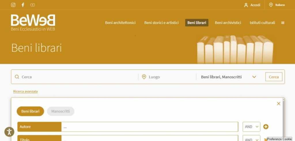BEWEB CATALOGO DELLE BIBLIOTECHE ECCLESIASTICHE https://beweb.chiesacattolica.it/benilibrari/?l=it_IT#formAdvanced=open Condividi: Condividi su X (Si apre in una nuova finestra) X Condividi su Facebook (Si apre in una nuova finestra) Facebook Mi piace Caricamento...