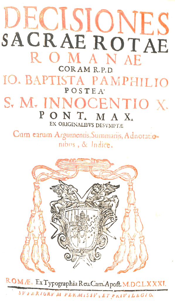 Decisiones Sacræ Rotæ Romanæ coram r.p.d. Io. Baptista Pamphilio posteà s.m. Innocentio X. … ex originalibus desumptæ. Cum earum argumentis, summarijs, adnotationibus, & indice