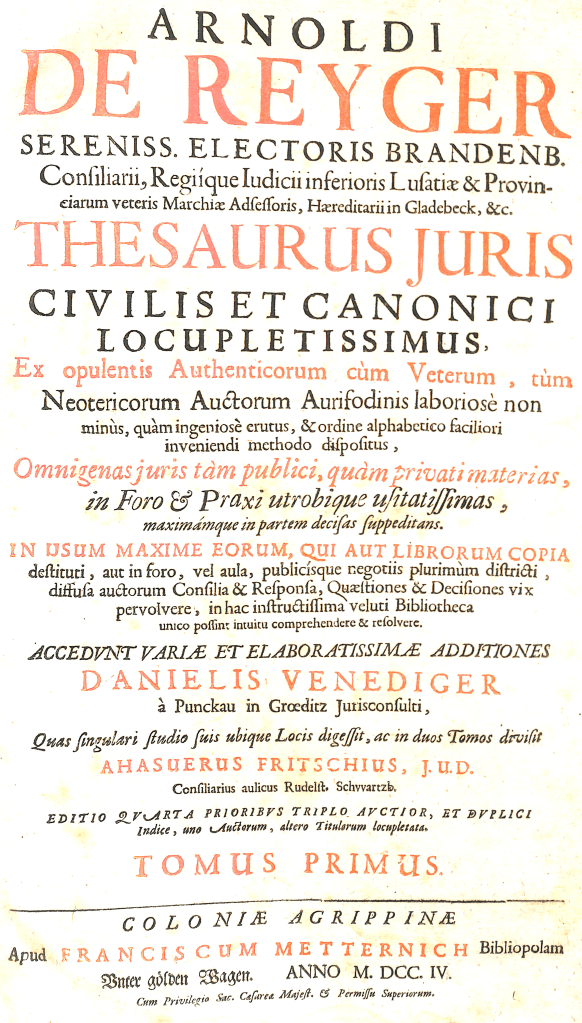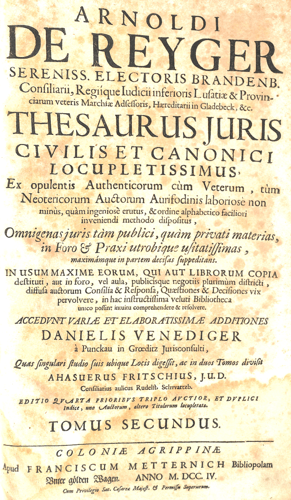 1: Thesaurus juris civilis et canonici locupletissimus, ex opulentis authenticorum cum veterum, tum neotericorum auctorum aurifodinis laboriosè non minus, quam ingeniosè erutus, & ordine alphabetico faciliori inveniendi methodo dispositus, … Accedunt variae et elaboratissimae additiones Danielis Venediger à Punckau in Groeditz jurisconsulti, quas singulari studio suis ubique locis digessit, ac in duos tomos divisit Ahasuerus Fritschius, J.U.D. consiliarius aulicus Rudelst. Schvvartzb.